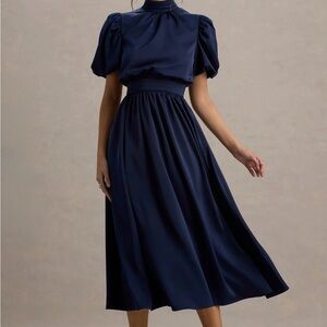 Brand new with tags. Elegant navy midi dress crafted from premium stretch satin. Features puff sleeves, a high neckline, and a beautiful self-tie bow at the back. Fully lined with an invisible zip closure and flattering stretch. Perfect for weddings, cocktail parties, or special occasions.
