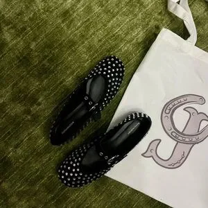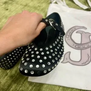Chic black flats with silver studs and buckle strap. Perfect for any occasion.