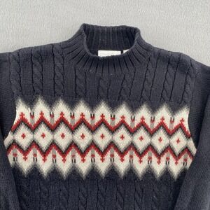 Color: Navy blue with cream and red Fair Isle pattern across front chest.