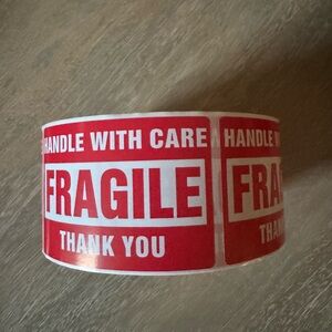 Roll of red 'Fragile' stickers. Perfect for packaging. Bold white text on red background.