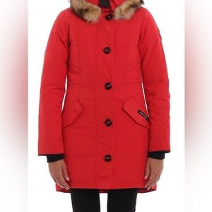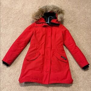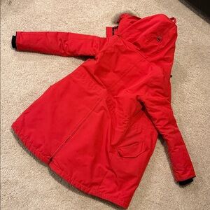 Stay warm and stylish with this vibrant red parka featuring a luxurious fur-trimmed hood. Perfect for chilly days.