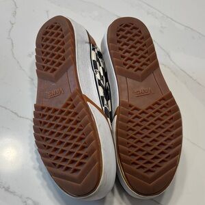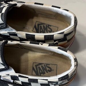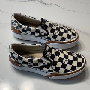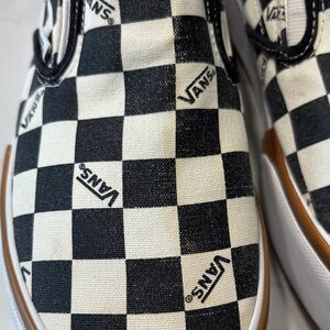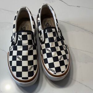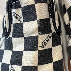 Classic checkered design. Comfortable slip-on style. Perfect for everyday wear. Pre owned condition: It has a small yellow spot on the front, as shown in one of the photos please view all the pictures and video for exact condition.