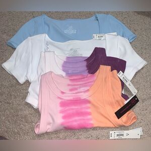 *6 PIECE BUNDLE* All NWT. 2 tie dye crop top tank tops. 2 tees. 2 bags. Shirts are all size M.