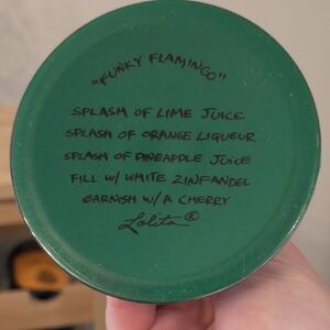 Charming set of 2 Lolita large plastic wine glasses. Features playful flamingo design. Pink and green accents. Perfect for entertaining. these are gently used & hand washed only. there's a drink recipe on the bottom.