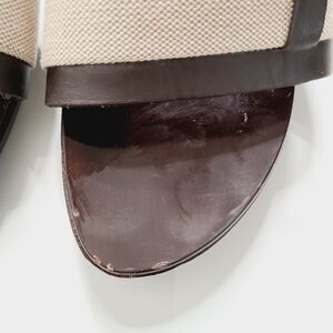 Pre-owned brown wooden and canvas clog sandals by Hermès in a size 38. Size US 8. Please see all pictures and feel free to ask questions. Does have signs of wear, but can be fix with a brown corrector.
