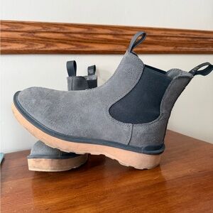 Stylish gray boots with tan soles. Durable and comfortable. Perfect for everyday wear.