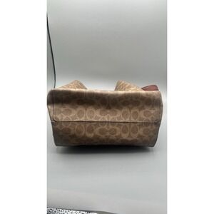 The COACH Willow Bucket Bag Signature in brown canvas is a stylish and authentic small shoulder bag perfect for travel and casual occasions. With a turn-lock closure and gold hardware accents, this designer bag features a classic colorblock pattern in tan with a red leather lining. The exterior is made of signature coated canvas and refined calf leather, while the shoulder strap is crafted from leather for a luxurious feel. This authentic Coach bag also includes an authentic certificate, making it a must-have for any fashion-forward woman looking for a classic and designer accessory.