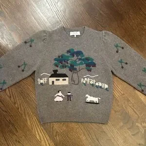 Charming brown sweater with detailed pastoral embroidery. Features a house, tree, and figures. Unique design by Sea New York.