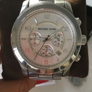 Stylish silver watch with chronograph features. Perfect for modern elegance.