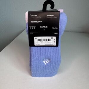 Stylish and comfortable Adidas crew socks. Perfect for athletic wear. Available in light purple, white, and blue.
