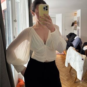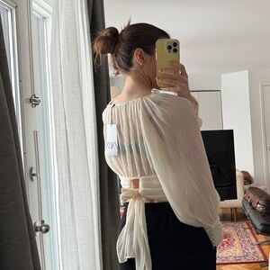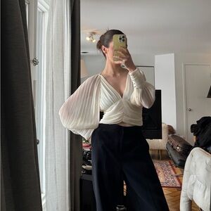 Zara ecru pleated blouse with a V-neck, sheer material, and balloon sleeves