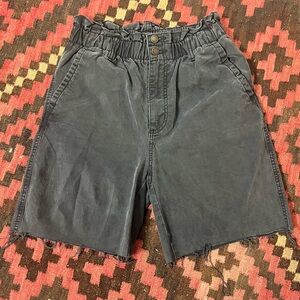 Stylish dark gray shorts with a frayed hem. Features an elastic waistband and button closure.