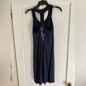 Vibrant mini blue dress with geometric patterns. Internal shelf bra and Racerback design. Perfect for casual outings. Worn once.