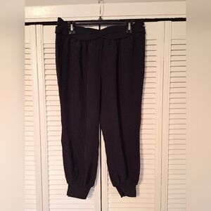 nice pair of black silk harem style pants from leifsdottir. zipper, button, and clasp closure in back and side pockets. very comfy and stylish. size is 6. waist is 16". excellent condition. cover photo shows how they fit