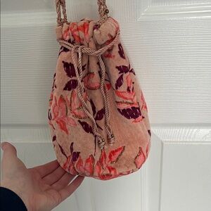 Chic and stylish floral drawstring bag in pink and red. Perfect for adding a touch of elegance to any outfit.