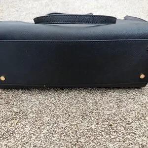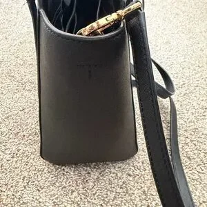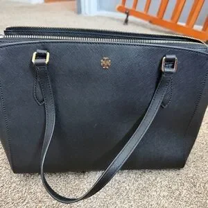 Chic black leather shoulder bag by Tory Burch. Features sleek design and gold-tone logo. Perfect for daily wear. Small scraps as pictured. Measures 11.5” x9”x5”.