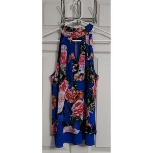 Rose Olive Blue Floral Keyhole Halter Neck Sleeveless Layered Top Womens Med C45