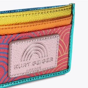 This Southbank Card Holder is crafted from a pink canvas with metallic rainbow repeat design. There are multi-color trims across the card holder.