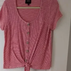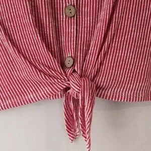 Chic pink striped tee with button-down front. Features a stylish tie-front design. Perfect for casual wear.