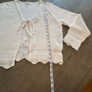 Chic white cardigan with a tie-front. Features a textured knit and scalloped hem. Perfect for layering.