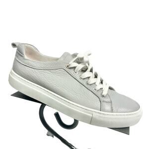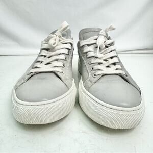 Great used condition! Light gray leather sneakers with a white midsole. Lace up style with a round toe. Silver-toned rivets and back pull-tabs. A classic addition to any wardrobe.