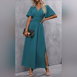 NEW Chic Ruched Waist Flutter Sleeve Maxi Dress Teal Green Blue