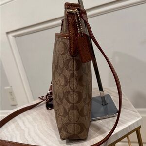 Elevate your style with this authentic Coach Signature Crossbody Bag. Crafted in the classic Coach monogram canvas with rich brown leather trim, this bag is perfect for both casual outings and chic city adventures. This bag is of a very large size!
