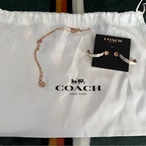 Stylish Coach Rose Gold jewelry set. Features a necklace, floral earrings and enamel/rose gold hoops. All in excellent condition and includes dust bag.