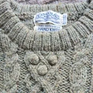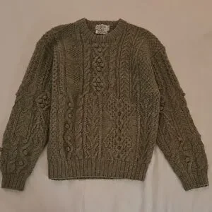 Women's warm 100% pure British wool chunky cable knit sweater in a soft moss green hue. Crew neck. Size large. Measures approximately 20 inches across chest from pit to pit without stretching. Body length is 25 inches from shoulder to hem. Outstanding durability and quality. Like new. Perfect for chilly days.