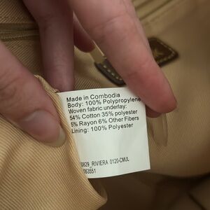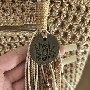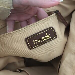 This is a lined tan tote bag from The Sak. It has a textured layer on the outside.
