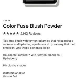 Talc-free blush with fermented arnica that helps reduce redness and hydrating squalane and hydraberry that melt onto skin. One swipe blendable color.