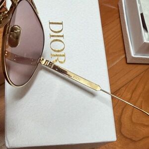 Stylish Dior sunglasses with a luxurious gold frame. Features elegant pink lenses. Perfect for a sophisticated look.