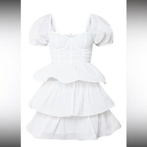 This elegant white dress features stylish puff sleeves and a flattering tiered design. Never worn before.