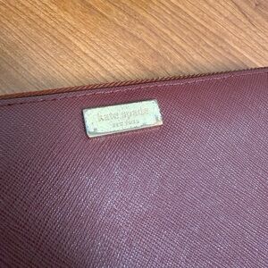 Kate Spade burgundy wallet Neda Newberry Lane saffiano leather. This wallet can hold all of your credit cards has a zipper compartment for your coins two slots for your bills in outer compartments it fully zips this comes from a smoke free home. It’s in great condition except for the nameplate has some scratching and where zipper is fully intact and works.