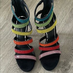Chic, black heels with vibrant rainbow rhinestone straps. Perfect for a bold look! 4” heel. Size: 7. Brand~new!