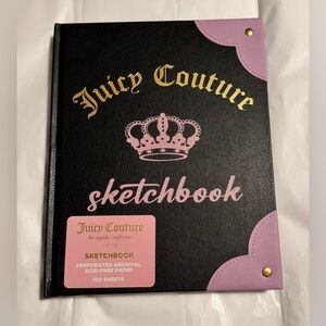 Juicy Couture Black and Pink Sketchbook with Gold Accents) Elegant sketchbook with black cover and pink corners. Features gold lettering and crown design.