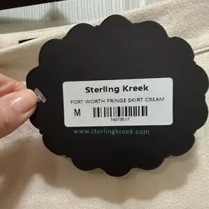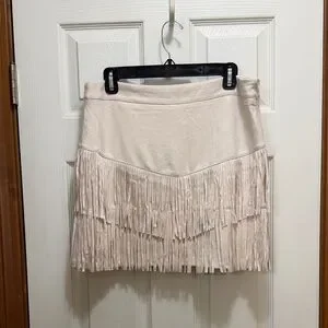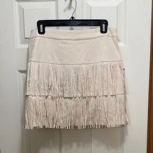 Step out in style with this elegant cream mini skirt, featuring playful fringe accents. Ideal for any event.