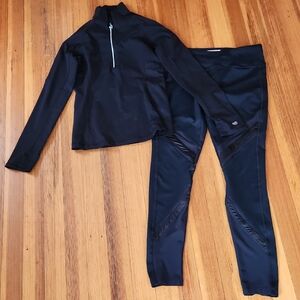 Sleek black leggings set from Forever 21. Ideal for workouts or casual outings. Features a zip-up top and comfortable fit.