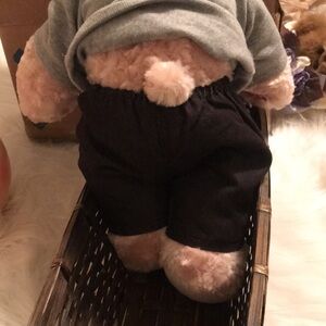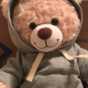 Adorable teddy bear in a cozy gray hoodie. Perfect for cuddling and playtime. it has a little speaker that says I love you it is so cute dress well very clean perfect for a child or wherever you want it.