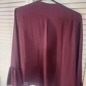 Chic mauve blouse with a flattering V-neck. Features stylish ruffled sleeves.