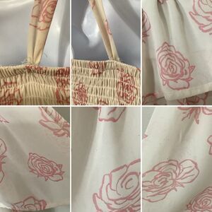 Cottage Bohemian Boho Spring Summer Aesthetic Whimsical Ruffles Floaty Flowy Rose Print Cream Pink Ruched Sheering Stretch Top Strappy Mid Length Dress