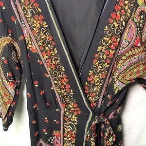Zara Black Paisley Wrap Dress with fringe detailing on the hem and waist tie. This dress features a floral and paisley print, a V-neckline, and 3/4 length sleeves.
