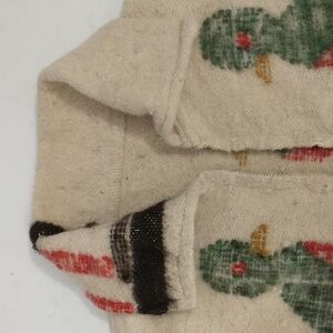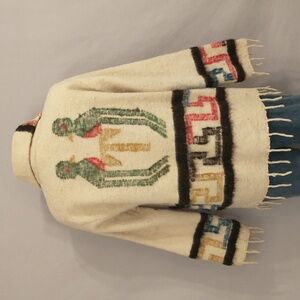Fabulous vintage jacket handcrafted in wool. Geometric pattern with 'Love Birds' - parrots maybe? Natural undyed base color with dark brown, gold , red, blue and green. No tags. Is washable, was washed - treat as a wool sweater, hand wash, roll in a towel to blot and flat dry. For sizing please go by measurements. Length 26" plus 3" fringe, pit to pit 21.5", chest 43", center of neck to wrist 31.5" plus 2" fringe. Condition excellent, a couple areas missing nap - see pics. No stains, holes or not excess wear. One of a kind, fun, timeless. Unisex women's or men's.