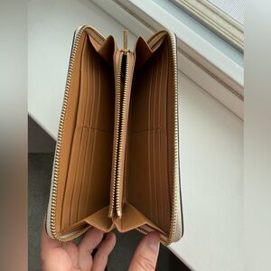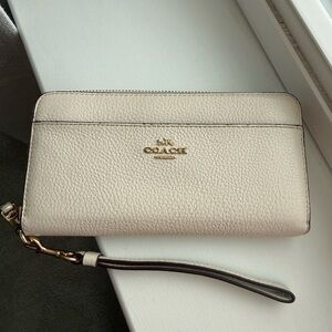 Chic Coach wristlet in ivory leather. Features elegant gold accents. Ideal for versatile use.