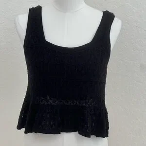 House of Harlow 1960 black crochet peplum tank top. It features a square neckline, wide straps, and a ruffled peplum hem