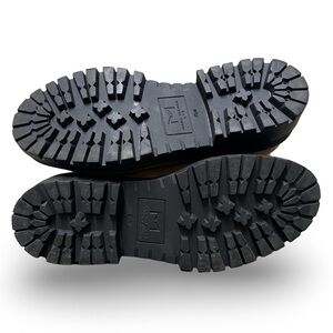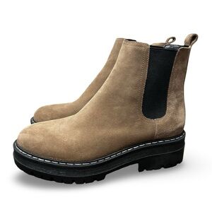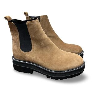 These pull on tan Suede genuine Leather Platform Chelsea Ankle Moto Combat Boots with a black Lug Sole by Marc Fisher are preloved with little sign of wear. Size 8.5