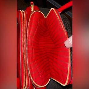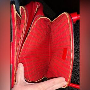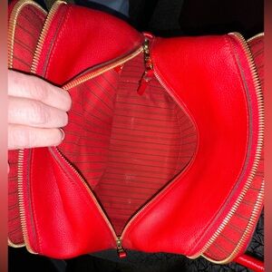 Truly beautiful bag. Leather has the LV pattern actually imprinted or stamped into the material (empriente = imprinted). Only minor signs of wear I see are some light scratching to the goldtone zipper pulls and little bottom feet. There are also a couple light white-ish marks on bottom of main compartment. I haven’t tried to remove - will see if it just brushes off. The bottom corners look great as do the handles. No missing piping or signs of heavy use whatsoever. No bad smells. Condition on REBAG was listed as “Great.” See stock photo for description of their condition scale. Three individual compartments offer lots of room - each one has its own zip closure. The largest section is the middle which offers a large open area and one interior zip pocket. The two side compartments are identical in size but have some slight differences inside. One is a plain large opening pocket that easily fits a Pro Max iPhone and then some. The other side is same size but also has two inner drop pockets for added organization. Striped fabric interior in all three sections. Comes with Poignant strap that can be used to keep the double handles together or to hang things from.