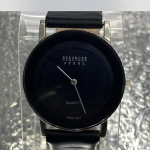 Sleek black Berenger Steel quartz watch. Elegant design with a classic black face and strap.