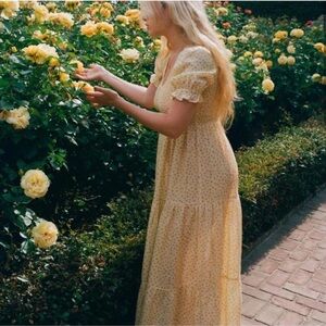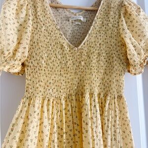 Charming cream dress with delicate floral pattern. Features smocked detailing. Ideal for any occasion.