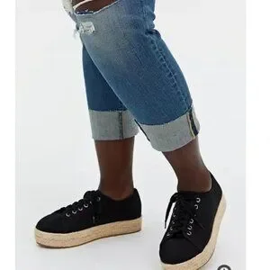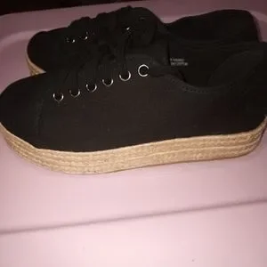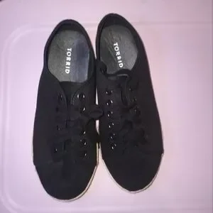 Black canvas espadrilles from torrid. Lace up, closed toe and a platform that measures almost 1.5 inches all around. These have been tried on indoors a few times by me, but have never been used. Size is 9.5 W - just marked as a 9.5, but all of Torrid's shoes automatically come in a wide width.
